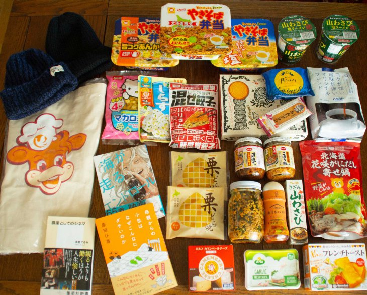 話題となったセコマ50周年記念のエコバッグ。柳月のお菓子。手編みのニット帽。自家製三升漬。書籍。乳製品などなどです。